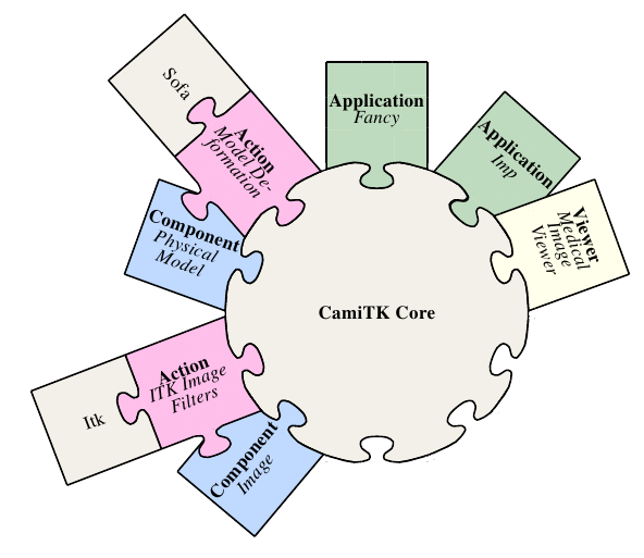 CamiTK follows the Components Based Software Engineering (CBSE) principles. Each new functionality to the framework is a new module represented as a dynamic library (.dll on windows, .so on Linux systems). These principles guarantee CamiTK to be higly modular and easier to maintain. CamiTK is provided with its core and basic modules (to handle 2D and 3D images using VTK for instance). You can easily add new modules to the framework or create new camitk-application.