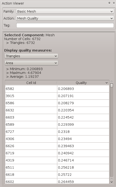 Display mesures of mesh quality listed by element types.