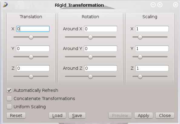 This action allows you to apply a linear transformation (translation,rotation around axes,scaling) the currently selected MeshComponents. More...