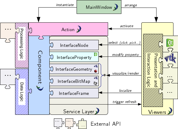 To do so, 'viewers' (application logic modules) are used to present and interact with the domain logic : the 'components' (the data logic, the data structures) and the 'actions' (the processing logic, the algorithms to be used on these components). In order to easily glue together all this modules CamiTK uses a Service Layer Pattern. This service layer can be seen as a contract from the viewers consumers of services provided by the 'components' and 'actions'. The viewers interact with the components without knowing exactly which kind of data it represents.