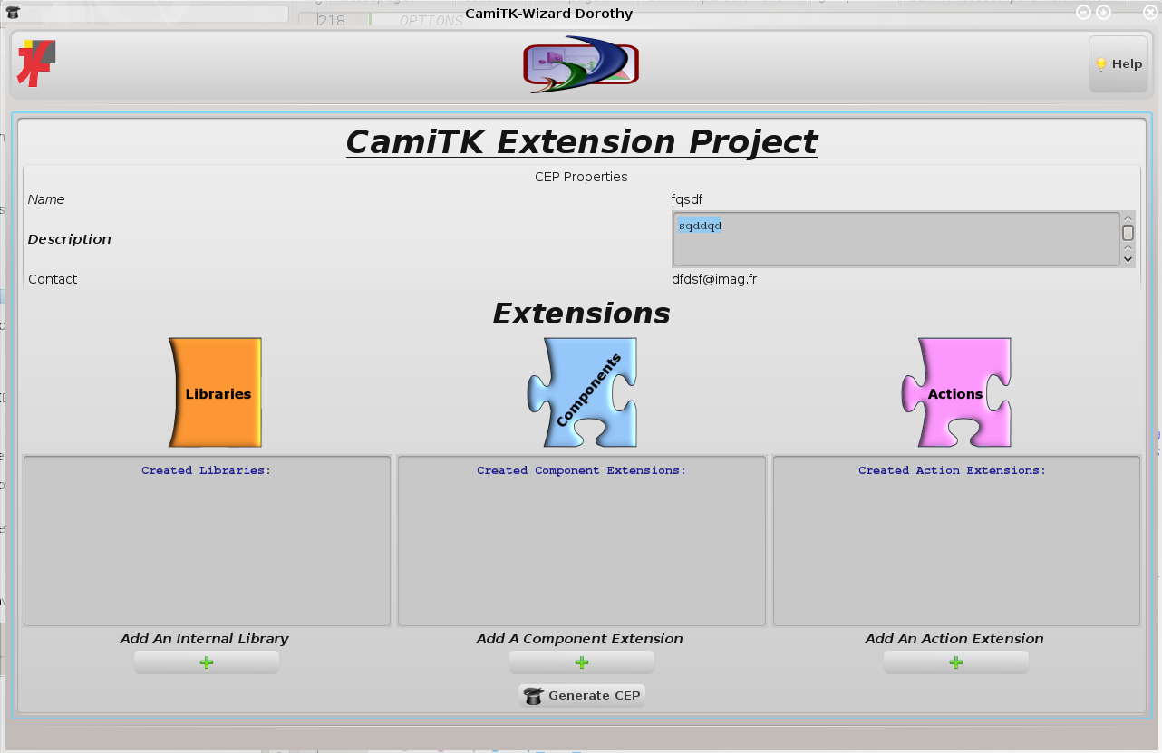 The Wizard application is the best application to start working with CamiTK : it allows you to create your CamiTK Extension Project (CEP) and add Actions and Components extensions to it. The wizard generate your CEP's files and the skeleton of your C++ classes of your extensions. Do not hesitate to take a look at the CamiTK wiki documentation on how yo uses the new Wizard in order to work with it. You may also use take a look at its implementation with the technical documentation.