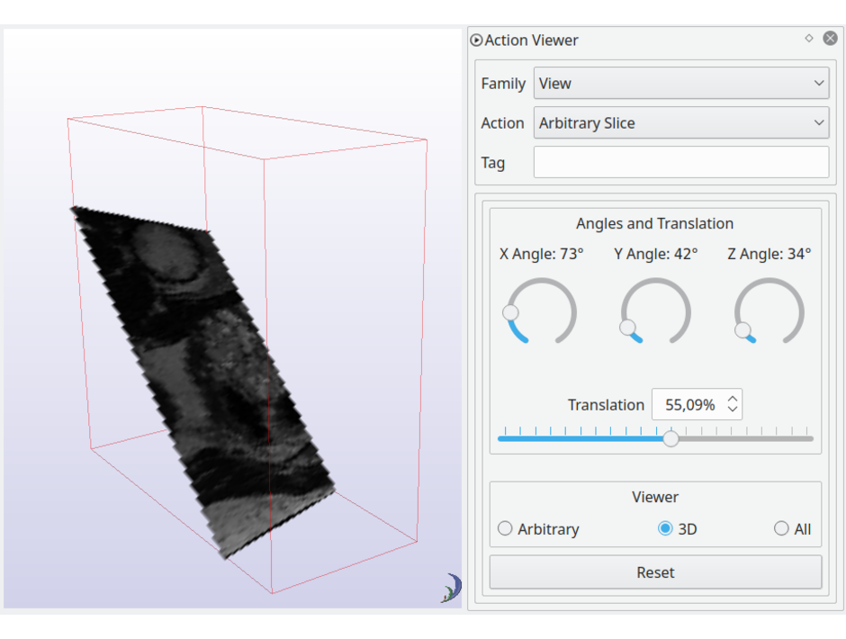 The GUI also allows the user to visualized the arbitrary slice in 3D only, in the medical image viewer or in the dedicated arbitrary slice viewer. Check the new “View → Arbitrary Slice” action!